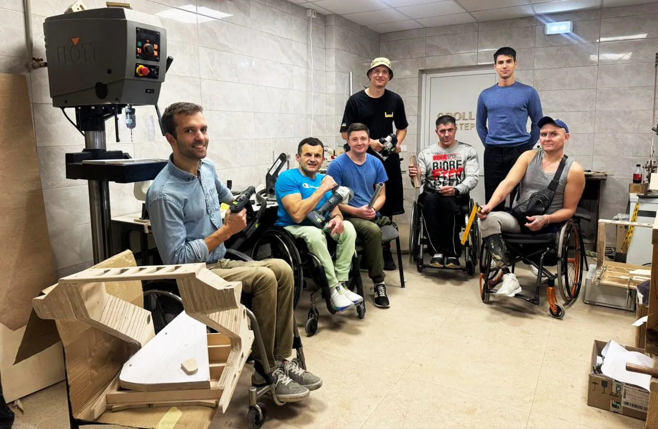 All'Unbroken Center, il centro di riabilitazione ha messo a disposizione una piccola stanza nel seminterrato di un edificio: circa 25 metri quadrati, ma sufficienti per allestire un laboratorio funzionante. Paul porta dalla Francia l'attrezzatura necessaria e allestisce la stanza in modo che i partecipanti possano lavorare in modo sicuro e confortevole. Il primo piccolo programma inizia subito: sei partecipanti si incontrano regolarmente per lavorare insieme sulle proprie sedie a rotelle. Per un periodo di quasi cinque settimane, il gruppo viene in officina cinque giorni alla settimana per circa tre ore alla volta.