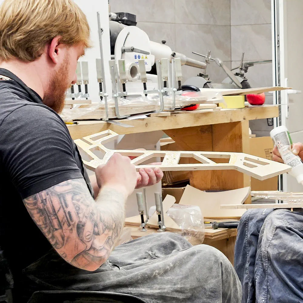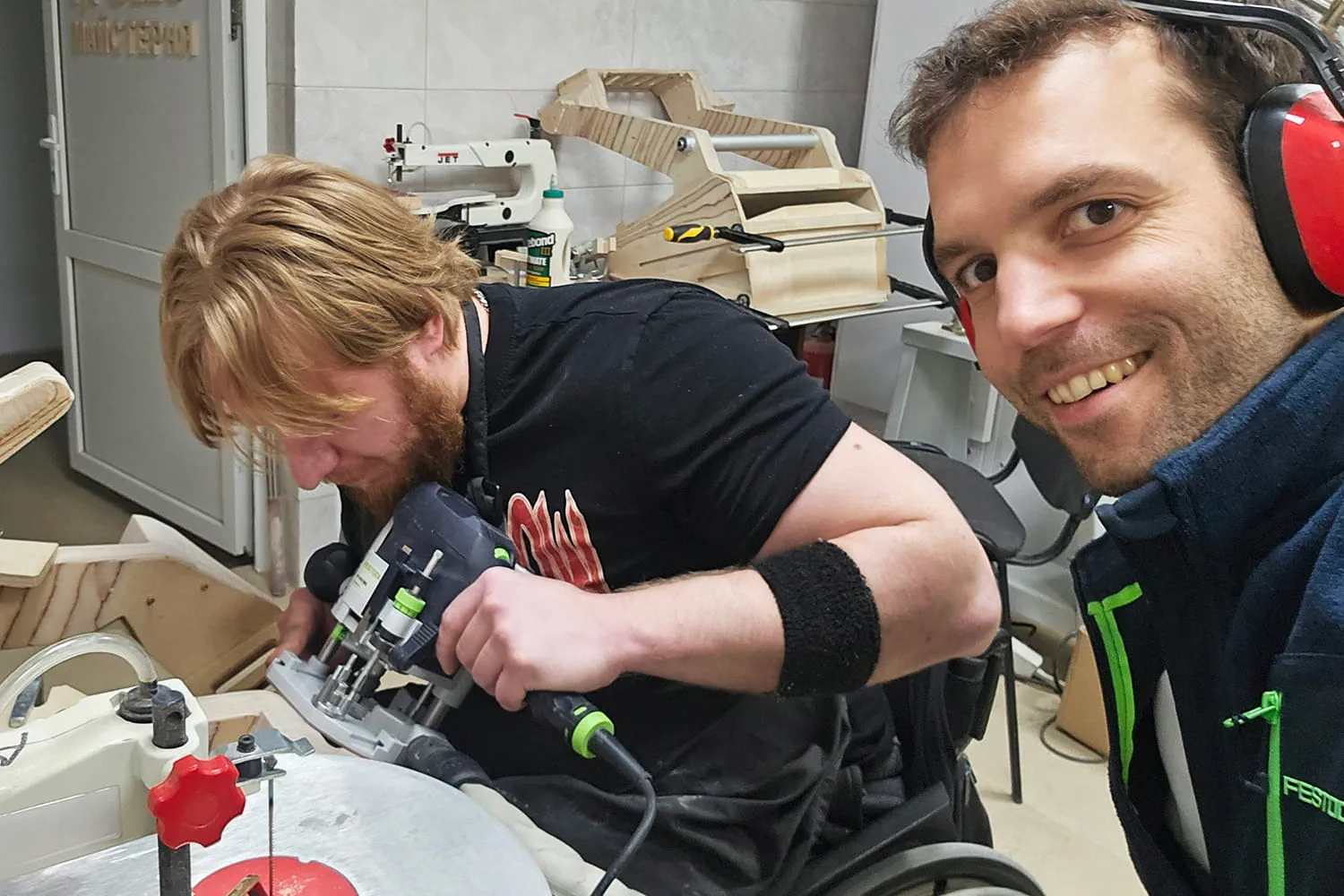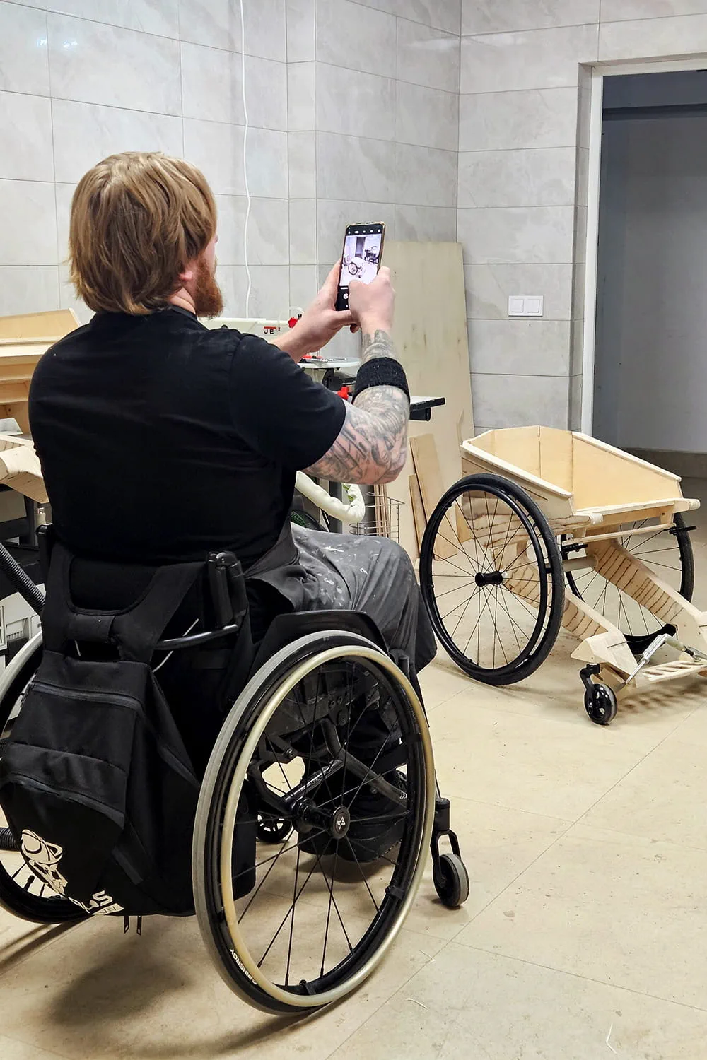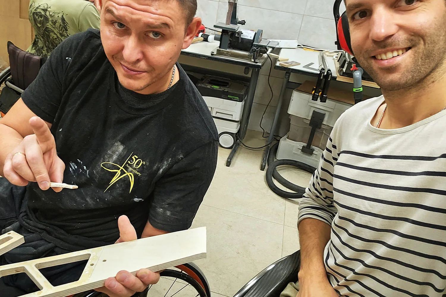 Passo dopo passo, vengono create sedie a rotelle personalizzate a partire da pannelli di legno e singoli componenti. Ma l'obiettivo del progetto non è solo quello di ottenere un ausilio finito. Il lavoro in laboratorio ha anche lo scopo di dare ai partecipanti una struttura nella loro vita quotidiana, una nuova motivazione e un obiettivo chiaro.