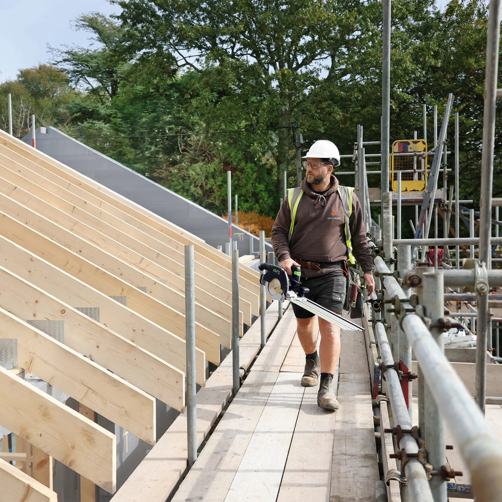 "Quando tagliamo a misura le numerose travi e i montanti strutturali, dobbiamo essere veloci e precisi. L'HKC con il Binari di guida è il mio compagno costante".