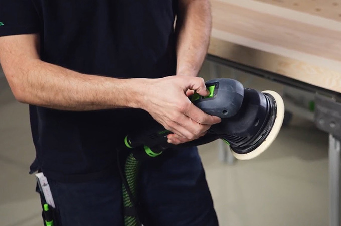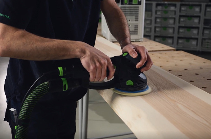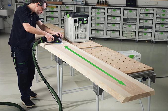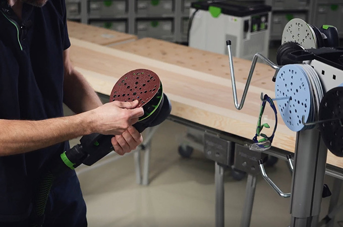 Le superfici in legno piallate presentano i cosiddetti segni di coltello, noti anche come segni di pialla, causati dai coltelli a spirale. Questi devono essere levigati prima del rivestimento superficiale. In questo modo si ottiene una superficie più liscia e omogenea e il rivestimento superficiale ha una presa migliore o riesce a penetrare meglio nel legno. Se non disponi di una grande levigatrice fissa, questa fase può essere eseguita con una levigatrice manuale. La ROTEX è l'ideale perché combina la levigatura grossolana e la levigatura rotorbitale in un'unica macchina. Poiché questo lavoro viene svolto principalmente in officina, è vantaggioso allestire la postazione di lavoro di conseguenza. Per questo motivo vorremmo parlare brevemente degli accessori del nostro sistema.