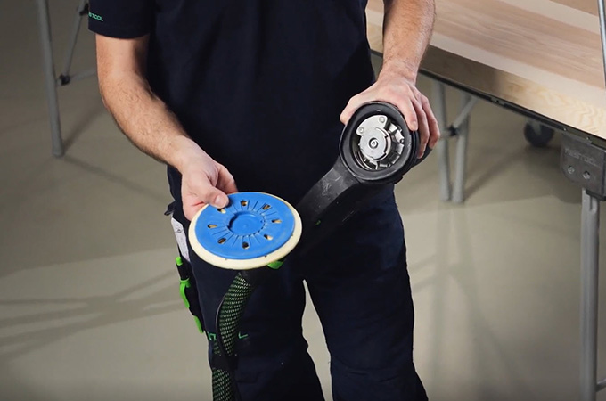 Il disco del ROTEX può essere cambiato molto rapidamente grazie all'interfaccia FastFix. Per farlo, scollega prima la spina di alimentazione e poi imposta il commutatore su levigatura grossolana. A questo punto si aziona l'arresto del mandrino. Il disco viene quindi ruotato in senso antiorario senza l'ausilio di attrezzi.