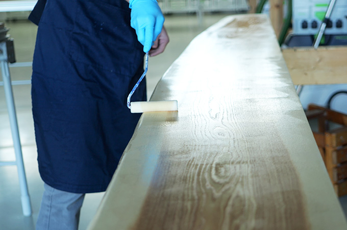 Per i legni come il rovere, è opportuno innaffiare la superficie prima della levigatura finale. Per farlo, inumidisci la superficie con una spugna o un panno umido. Le fibre del legno si sollevano e possono essere livellate con un'ultima levigatura fine dopo l'asciugatura. Durante la levigatura intermedia dopo il primo rivestimento superficiale, queste fibre vengono già tagliate e la superficie diventa ancora più liscia. L'ammollo è un grande vantaggio anche quando si lavora con i mordenti.