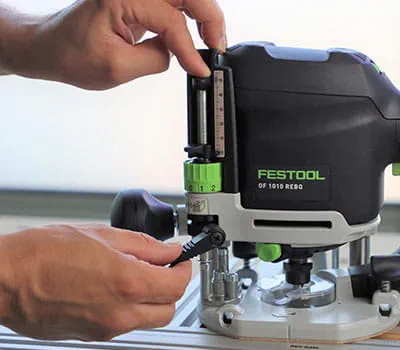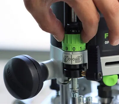 La profondità di fresatura può essere impostata ancora più velocemente e precisamente bloccando la ferramenta tra la regolazione della profondità dopo aver abbassato la fresa sulla superficie del pezzo.