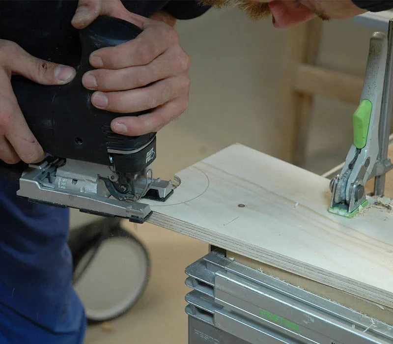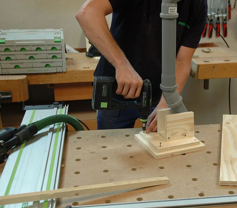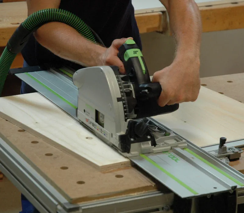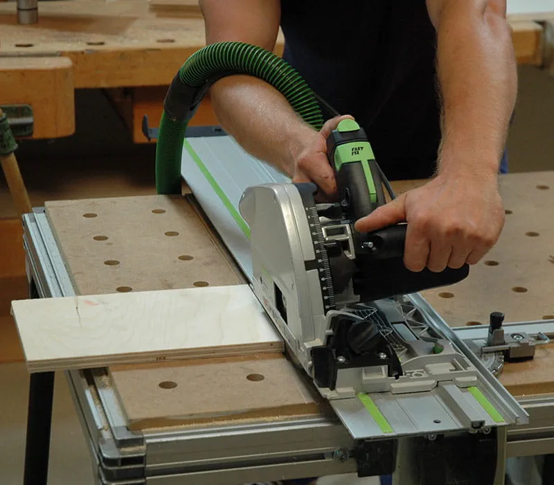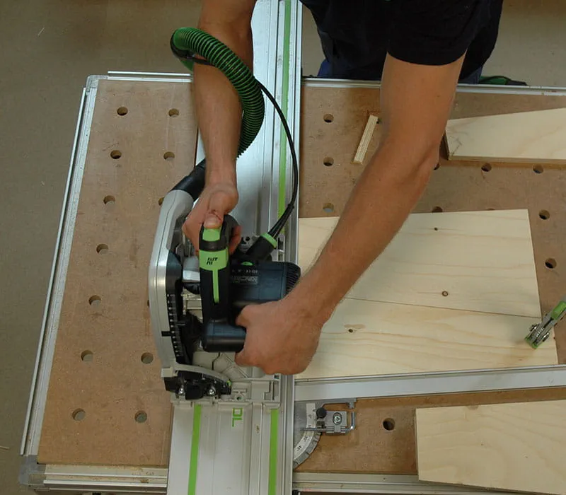 Utilizzando una sega circolare a cappa oscillante con binari di guida o una sega circolare da banco, tagliate i pannelli di compensato delle dimensioni indicate nell'elenco dei materiali. Quando si taglia sul piano multifunzione mostrato nell'immagine, è possibile impostare la guida di arresto inclinata di 5° e tagliare così le pareti della casetta in modo facile e preciso.
