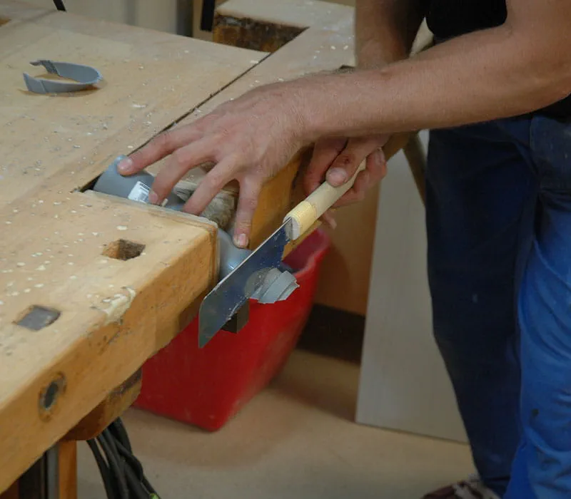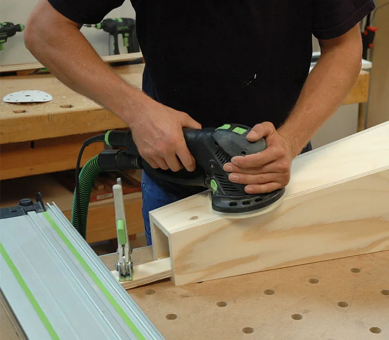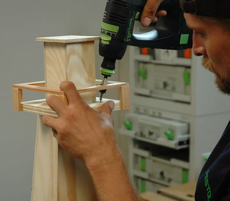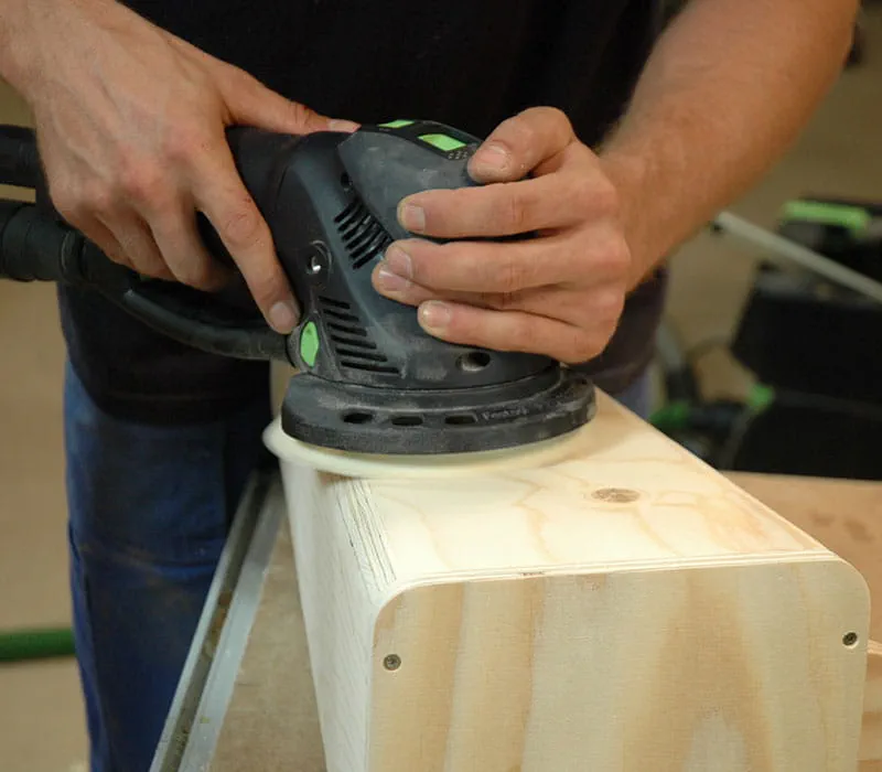 Gli angoli esterni della torre possono essere arrotondati con una fresatrice o un pialletto manuale. Quindi carteggiate tutte le parti della torre con un tampone di levigatura manuale e una levigatrice orbitale.