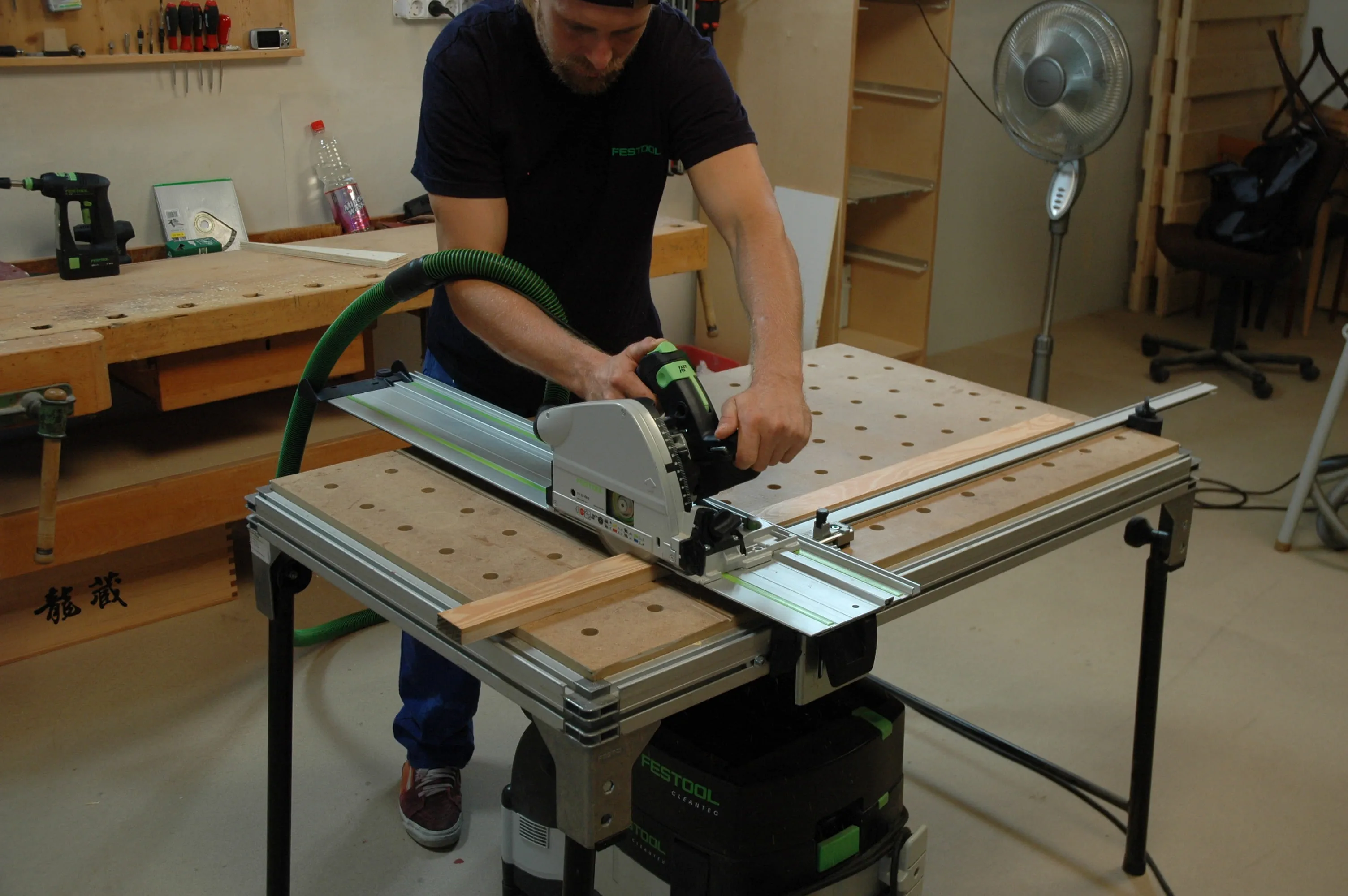 Utilizzando il tavolo multifunzione mostrato nella figura, è possibile impostare la guida di arresto inclinata e fissare saldamente il pezzo al tavolo. Questo permette anche di tagliare i profili di alluminio per le gambe.