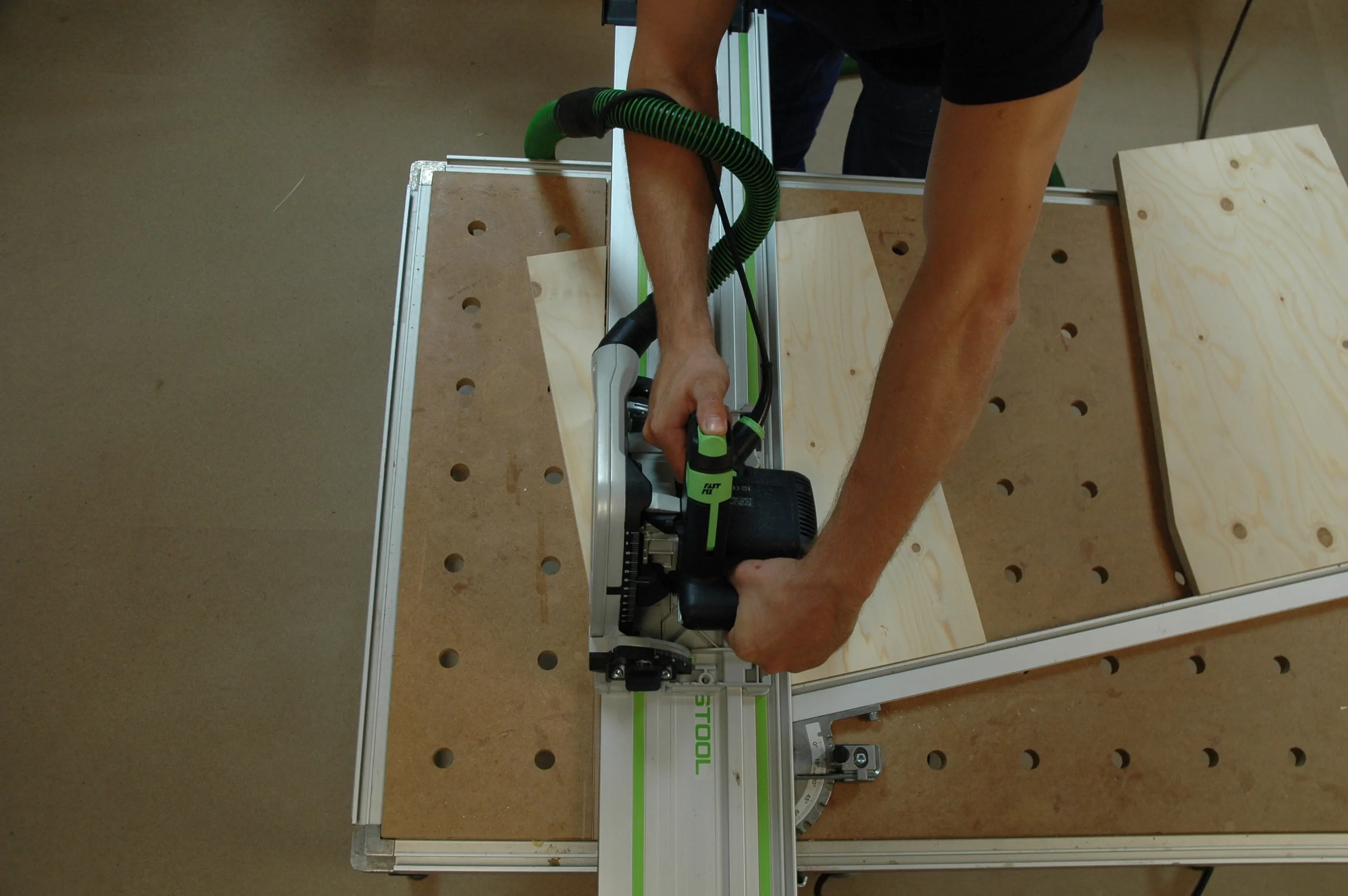 Il pannello anteriore (pos. 2) può essere tagliato ad angolo con una sega circolare da banco o in alternativa piallato. Anche nel piano d'appoggio (pos. 4) i fori da 3,5 mm sono stati preforati per le viti Spax.