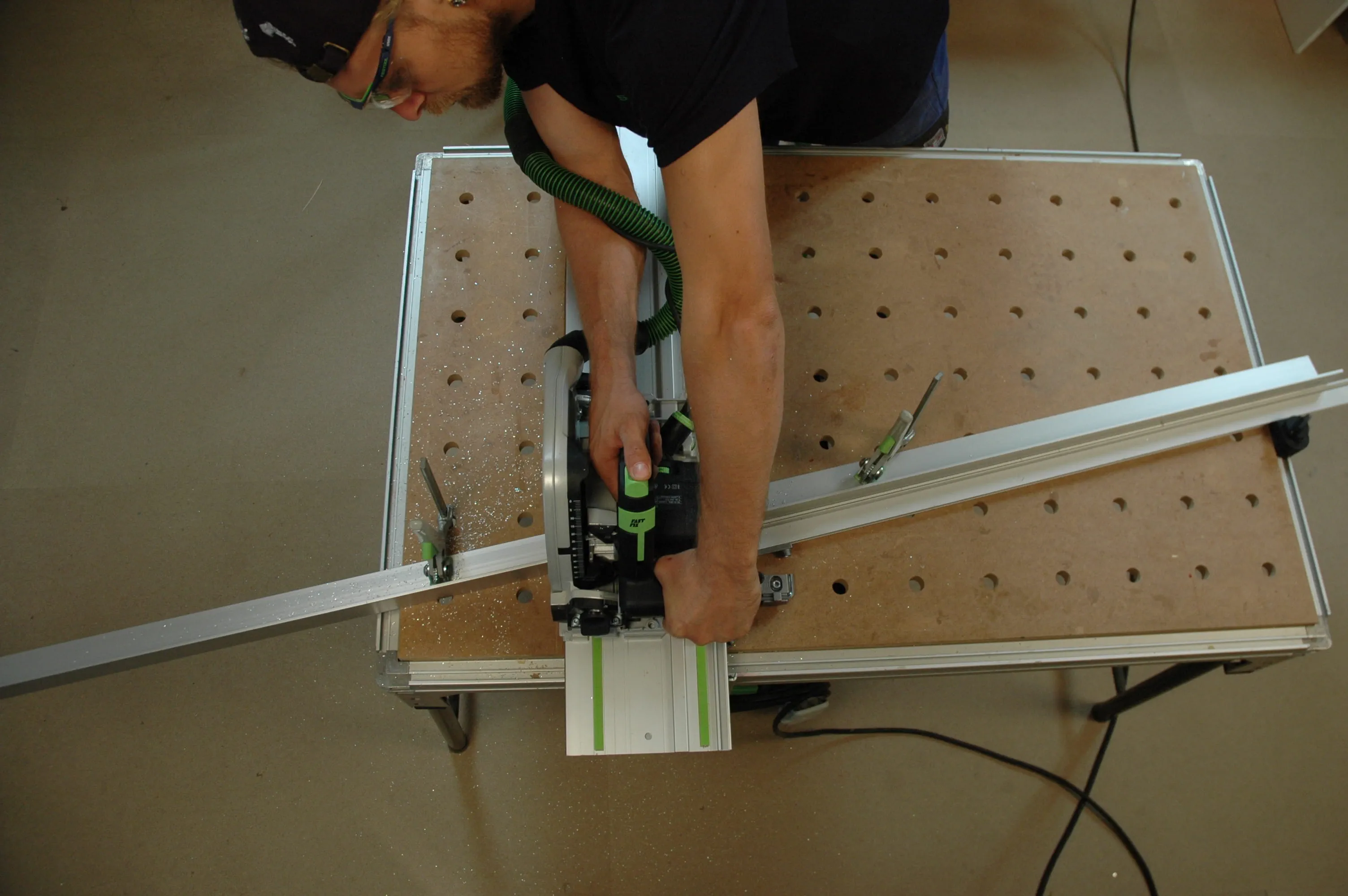 In questo caso, tuttavia, è necessario utilizzare la lama appropriata (dentatura universale o in alluminio) e ridurre il numero di giri. Importante: Indossate occhiali protettivi per proteggere gli occhi dai trucioli di alluminio.