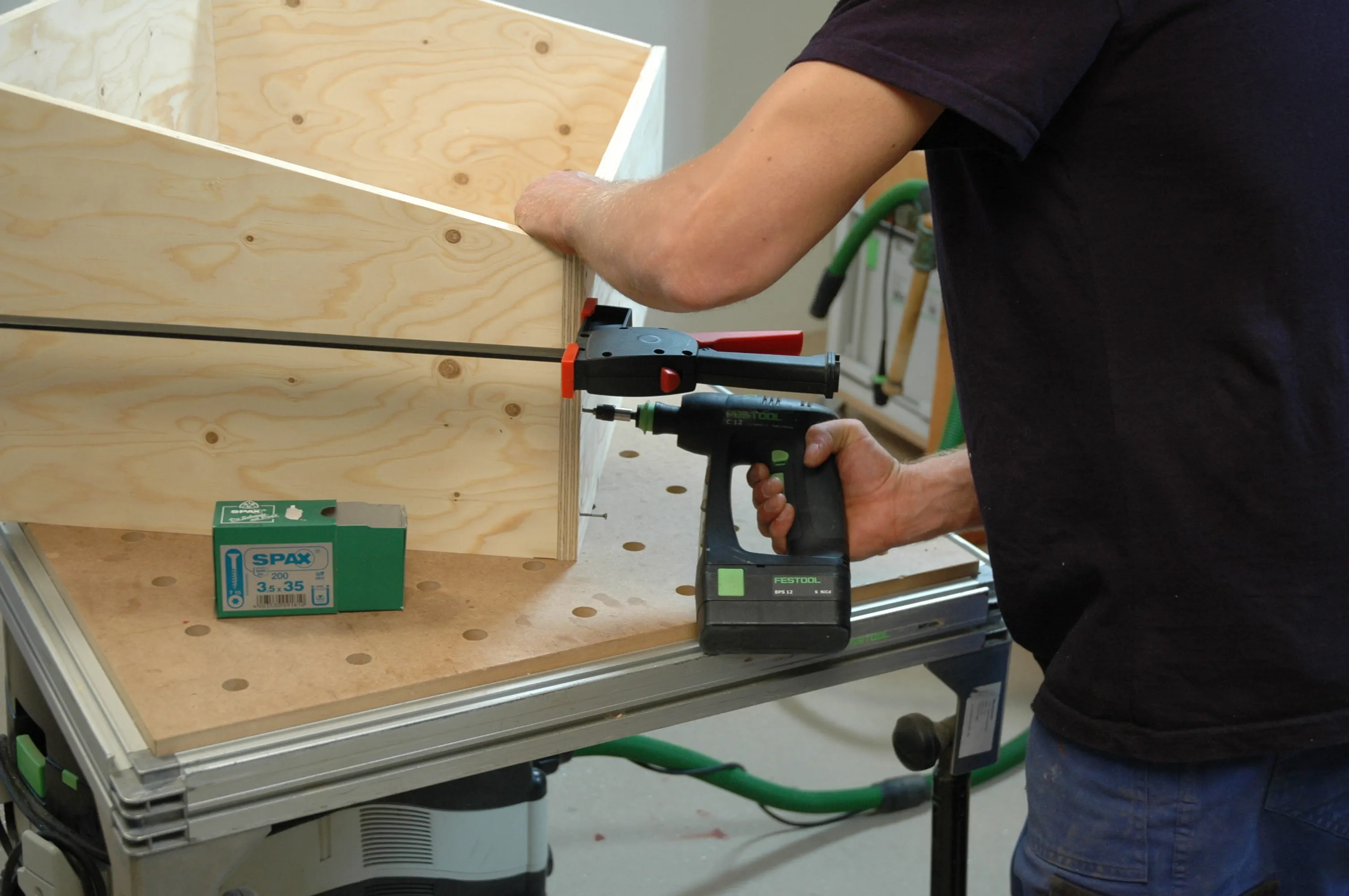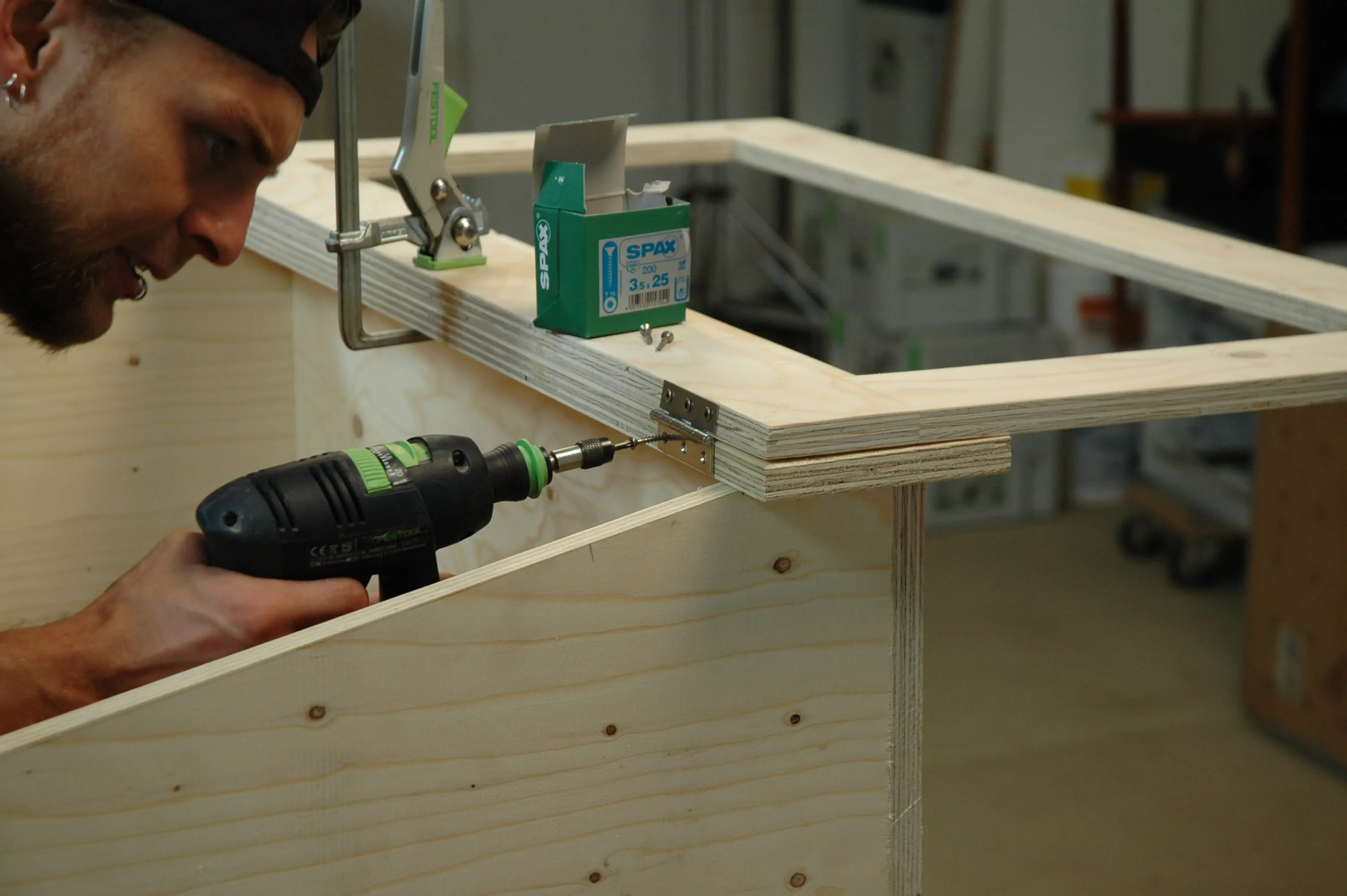 Forate i pannelli anteriore e posteriore (pos. 1 + 2) fori D = 3,5 mm per le Viti Spax (3,5 x 35). Le quattro tavole che formano la scatola sono fissate insieme con dei morsetti, allineate e avvitate.