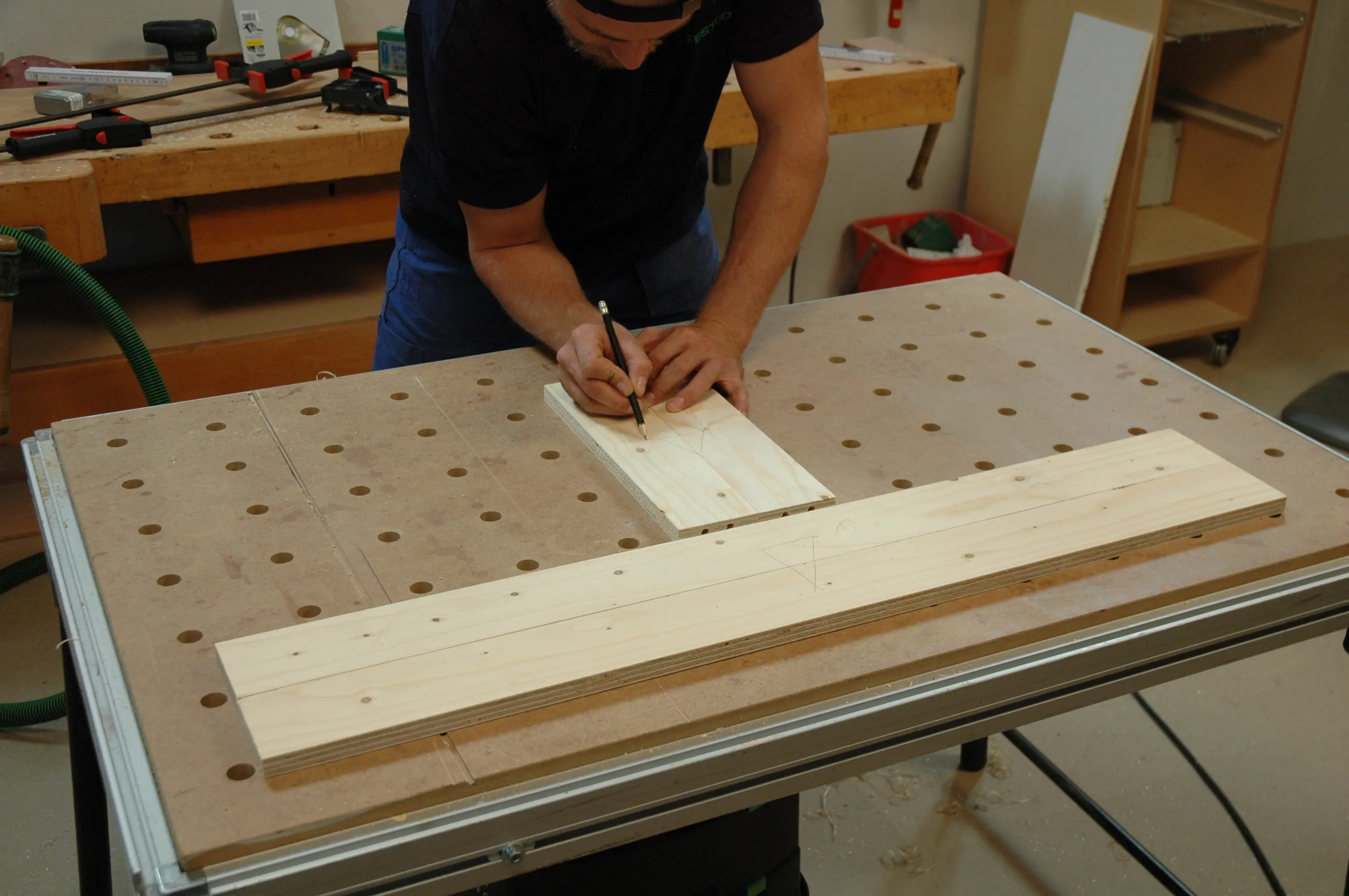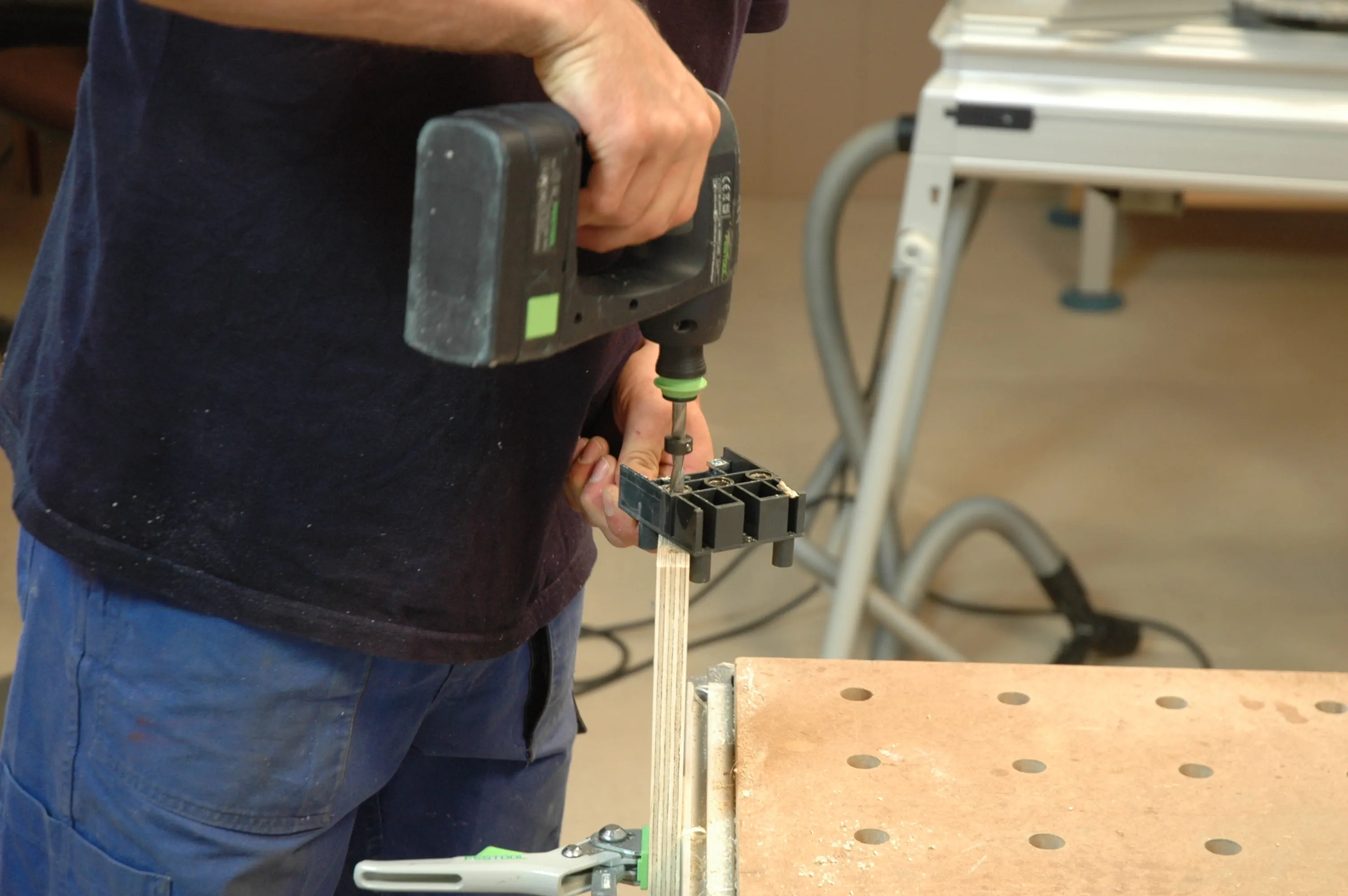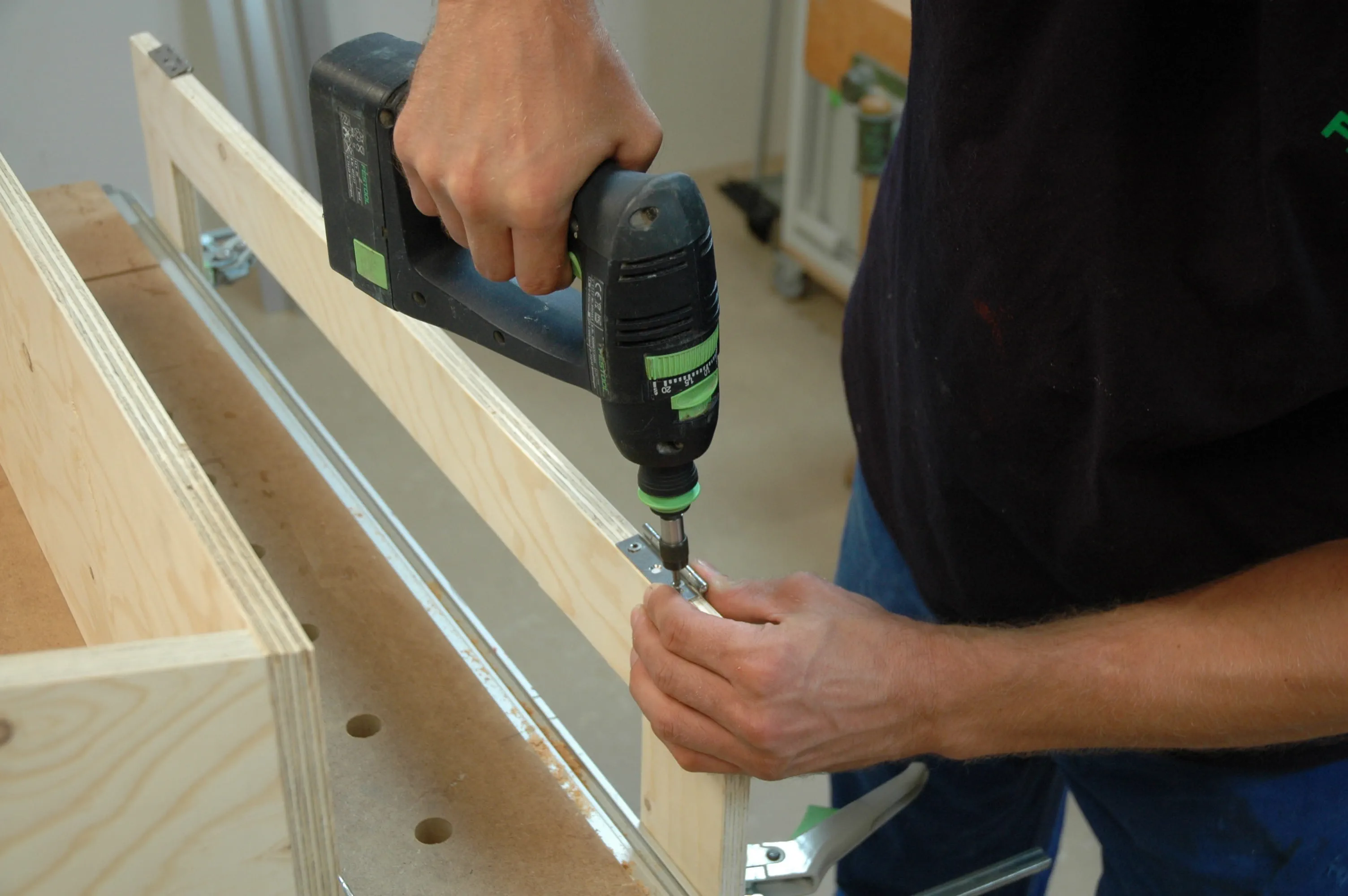 I fori devono trovarsi a circa 10 mm dal bordo e, se possibile, al centro della lastra. Inserite le punte dei tasselli nei fori e utilizzateli per trasferire i punti centrali sulla gamba lunga del telaio (pos. 5). Il pannello bloccato sul tavolo funge da battuta. Praticate anche qui i fori con la stessa profondità di perforazione.