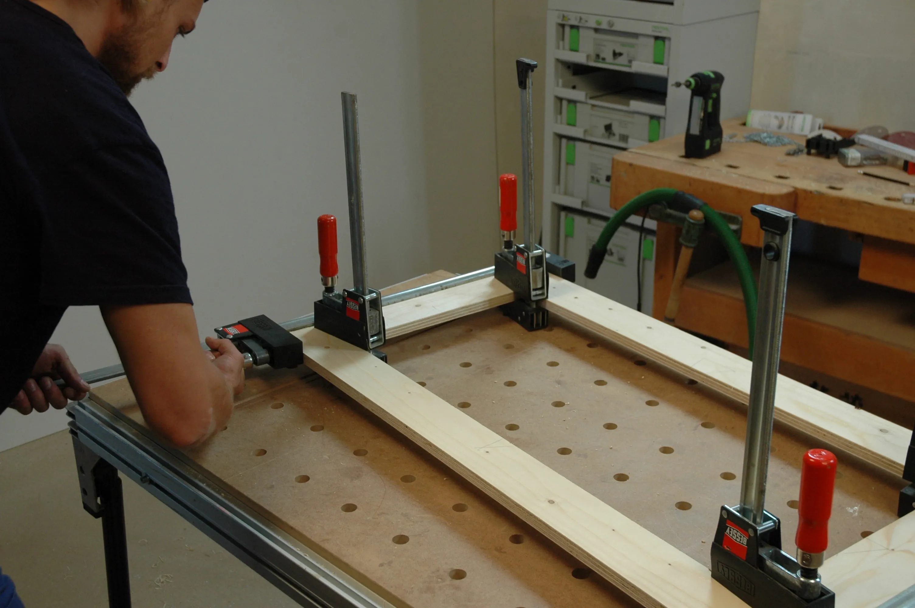 Versate la colla PU nei fori per i tasselli delle gambe corte del telaio e inserire i tasselli con il martello. Quindi, mettete la colla nei fori del banco e assemblate le parti del telaio. Fissate il telaio con dei morsetti.