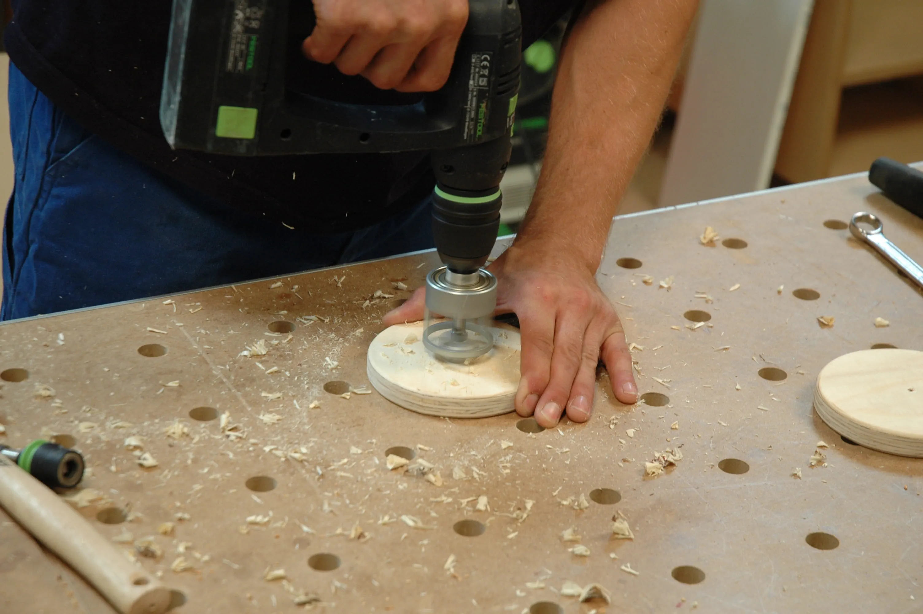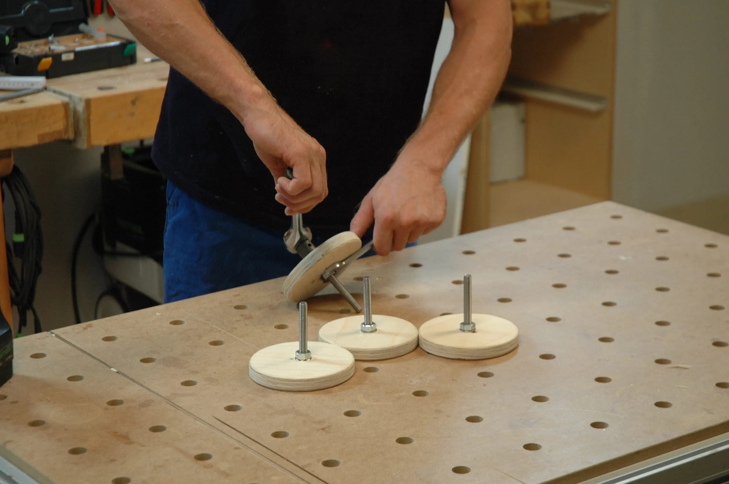 Per i piedini regolabili, tagliate dei dischi rotondi (articolo 16) dal compensato con un seghetto alternativo. Smussate (sbavate) i bordi con un tampone di levigatura manuale. Praticate fori di 30 mm sul lato inferiore dei dischi; la profondità di foratura corrisponde alla testa della vite da macchina (M 10 x 80) e a una rondella.