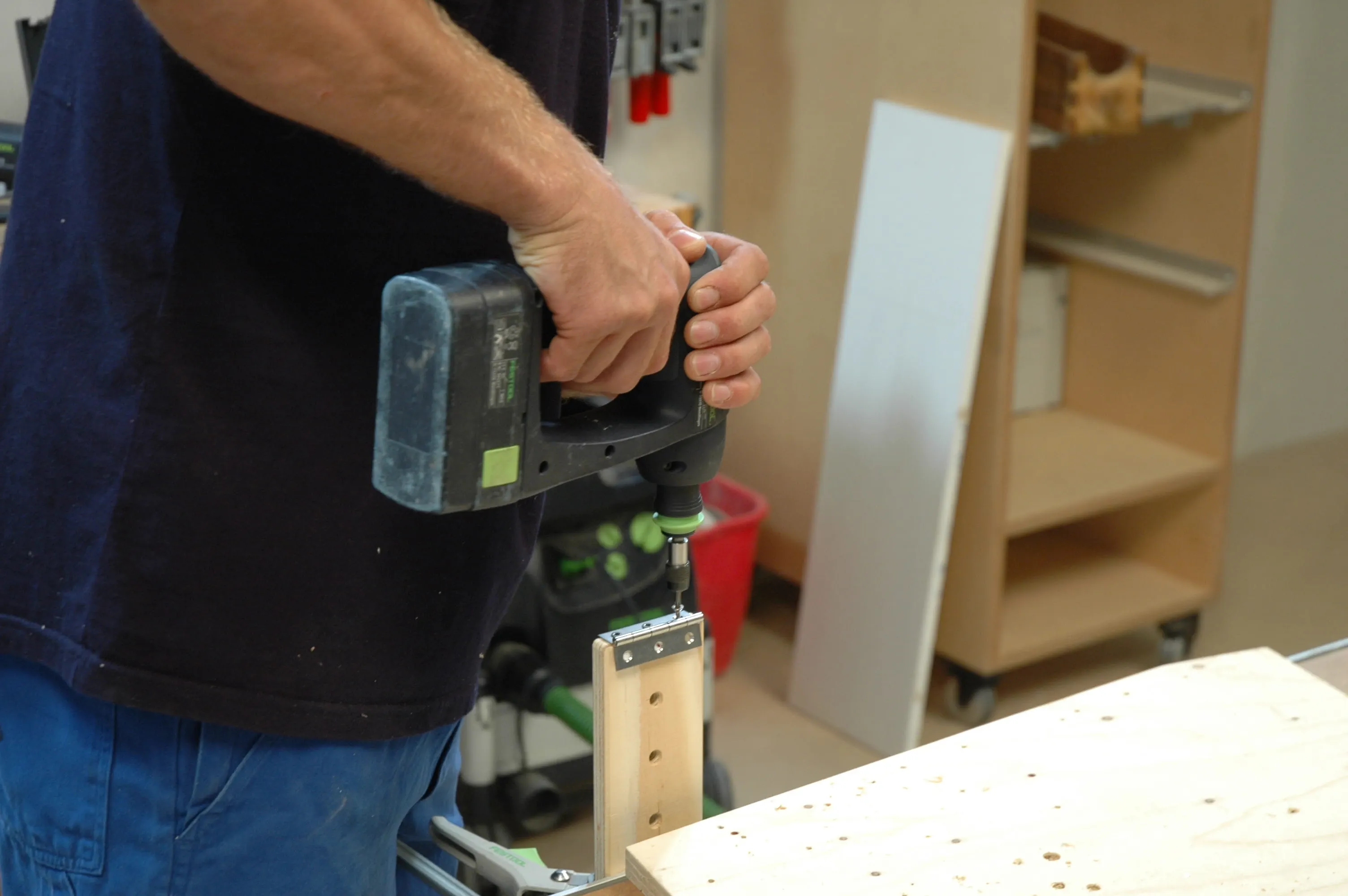 Segnate la sporgenza della tavola sotto il piano di appoggio, allineate il pannello alla cassetta e avvitatelo.
