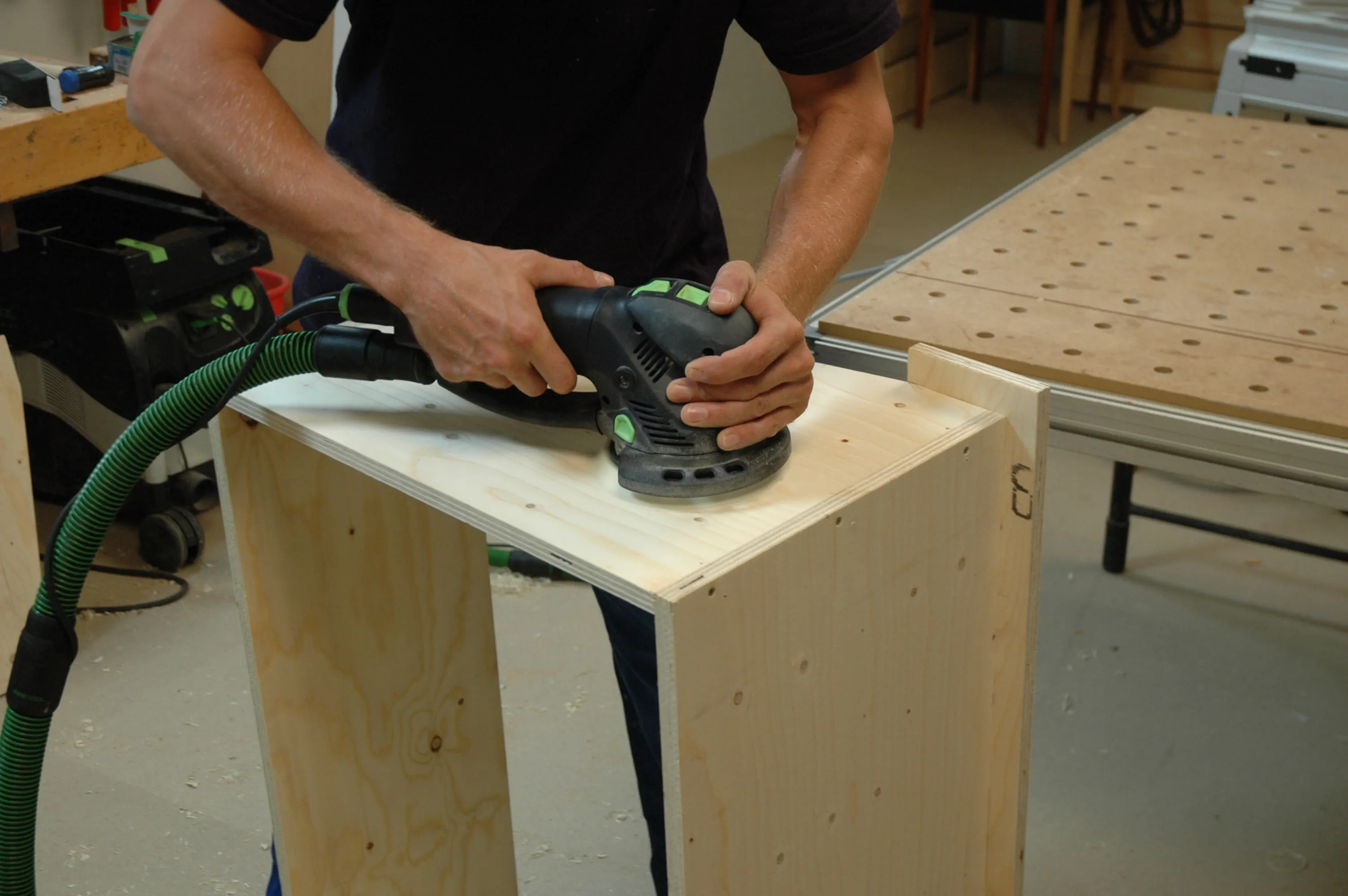 Dopo che la colla nel telaio si è asciugata, i morsetti vengono allentati e le giunzioni vengono levigate in modo uniforme con una levigatrice orbitale e carta vetrata con grana 120.
